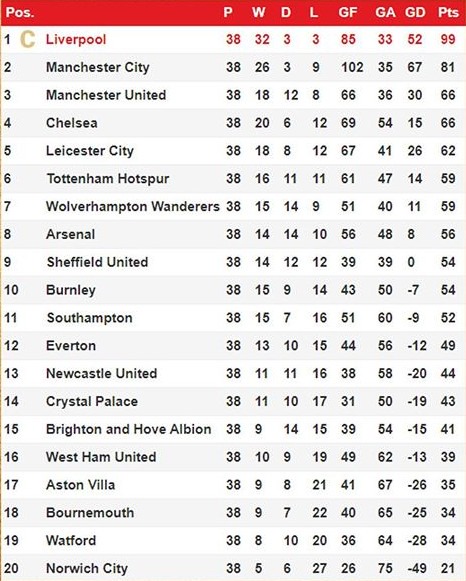 Positions 18 19 20. Liverpool won their first league title since 1990 the clubs first of the premier league era and 19th overall.