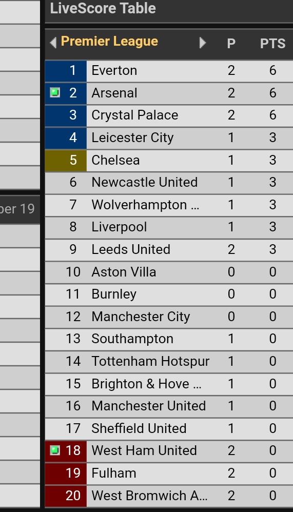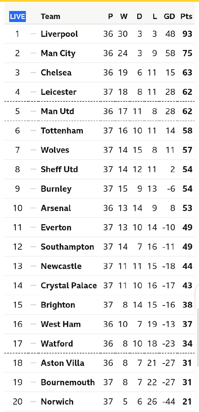 Epl table live. Complete table of premier league standings for the 20202021 season plus access to tables from past seasons and other football leagues. Heres how to watch 2020 21 premier league matches live online. 6 tot tottenham hotspur. Keep up to date with the latest premier league score premier league results premier league standings and premier league schedule.