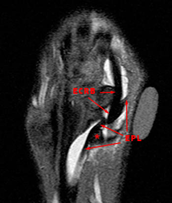 Epl tendon mri. This article reviews the normal anatomy of the extensor tendons of the wrist as well as the clinical presentation and mri appearances of common tendon abnormalities such as tears tenosynovitis intersection syndromes and associated or predisposing osseous findings. Mri findings are typical of tenosynovitis with fluid and high t2 signal intensity distending the tendon sheath of a thickened epl which frequently shows increased intrasubstance signal related to tendinosis 22 23. Extensor pollicis longus epl is a muscle of the deep compartment in the posterior compartment of the forearm. It is distinct from intersection syndrome which occurs more proximally in the forearm at the intersection of the first and second extensor compartments.
