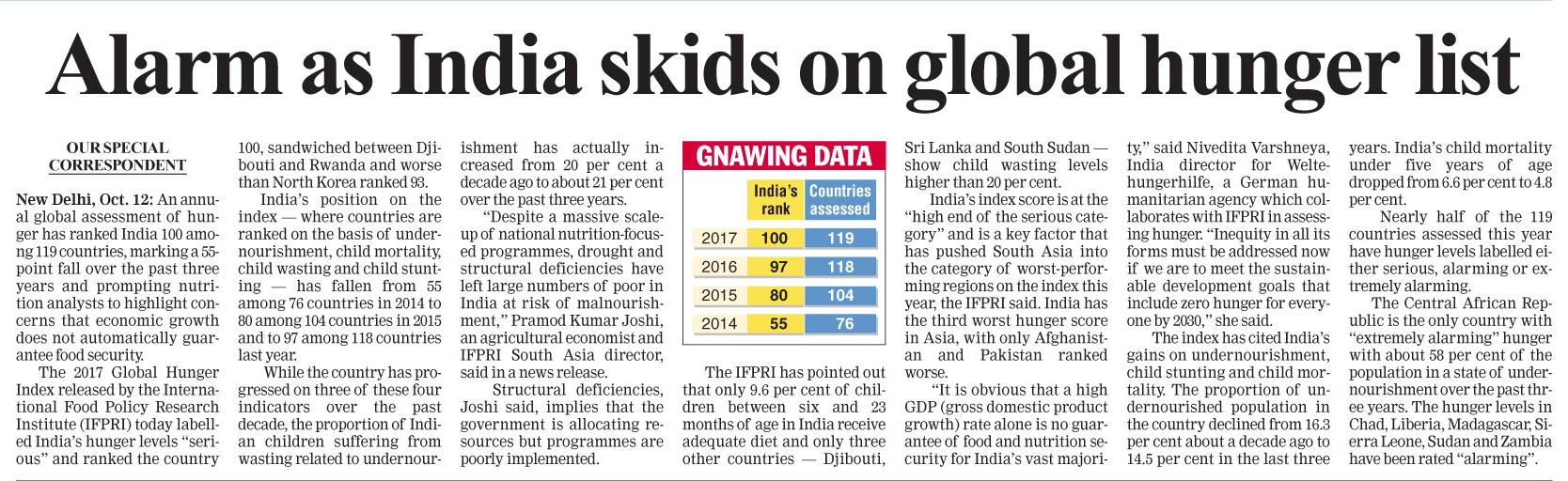 India ranked 94th among 107 countries on the global hunger index that tracks undernourishment child undernutrition and child mortality across the world. In both africa south of the sahara and south asia hunger is classified as serious owing partly to large shares of people who are undernourished and high rates of child stunting. The neighbouring bangladesh myanmar and pakistan too are in the serious category but ranked higher than india in this years hunger index. Last year indias rank was 102 out of 117 countries.