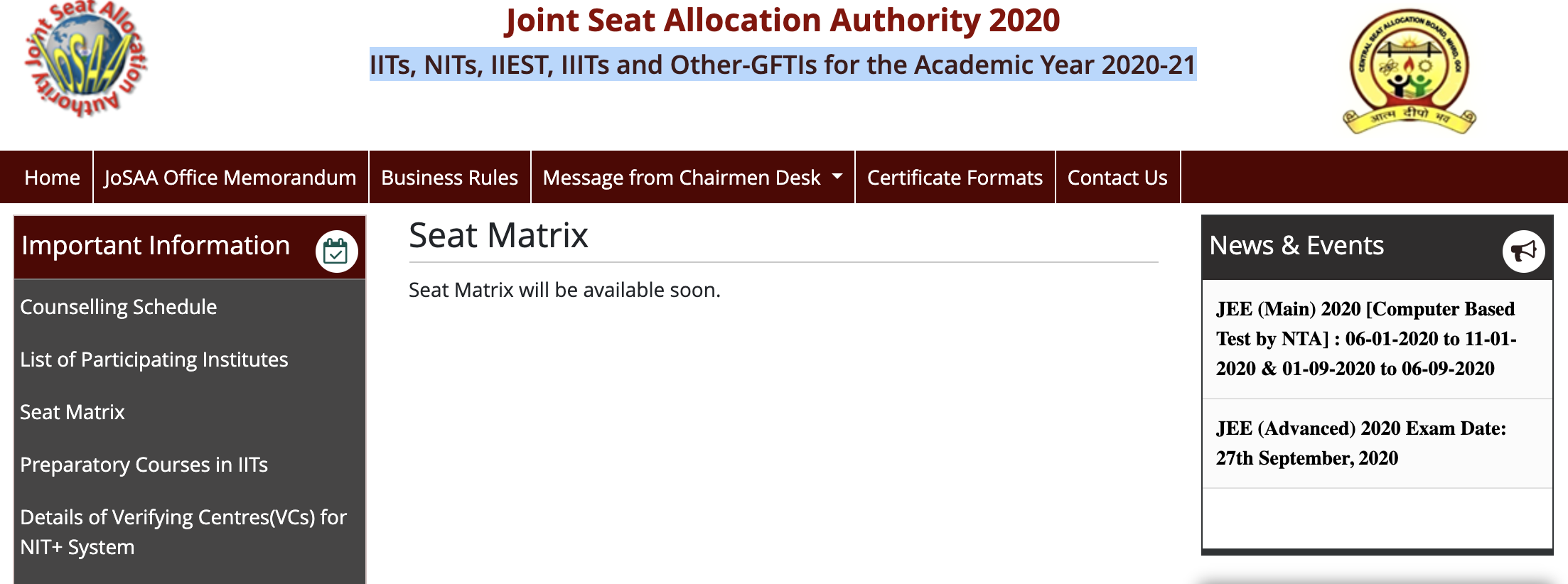 Josaa 2020 Seat Matrix