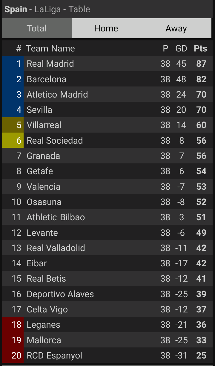 Laliga table standing. La liga table follow the spanish league table 2019 20. Spanish la liga table. Copa de la reina. Home away attack defense.