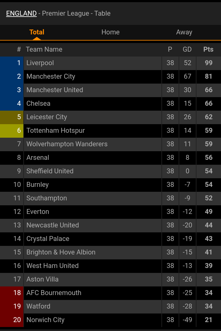 Premier League Table 2019 To 2020 Season