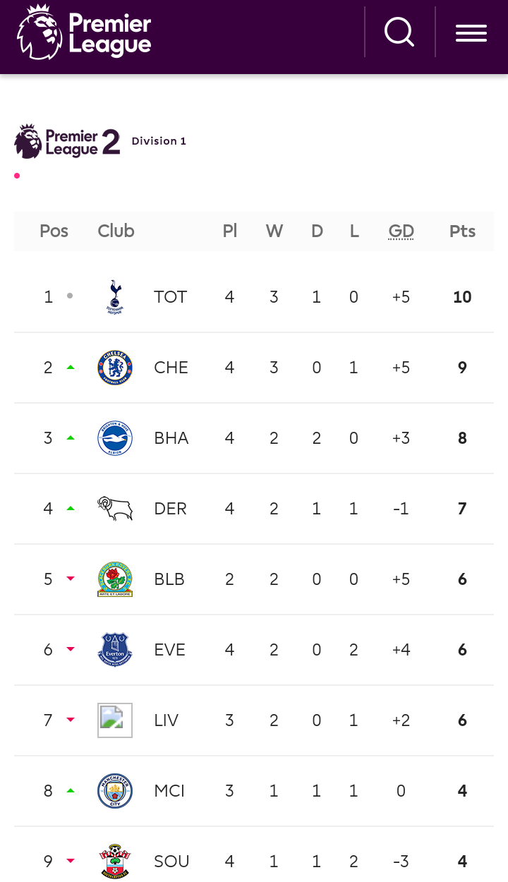 Cbs sports has the latest premier league news live scores player stats standings fantasy games and projections. Womens national league division one. U21 premier league division 2. W won 1 0 against tottenham hotspur on september 13th 2020.