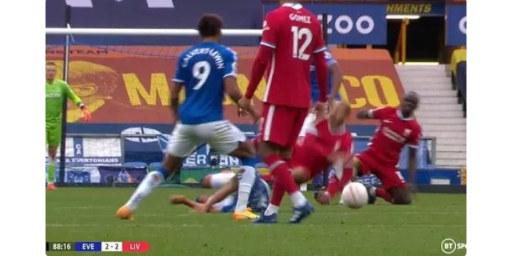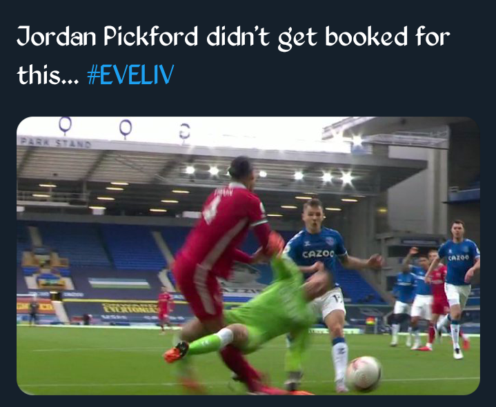 Van dijk was clattered knee high by everton goalkeeper jordan pickford.